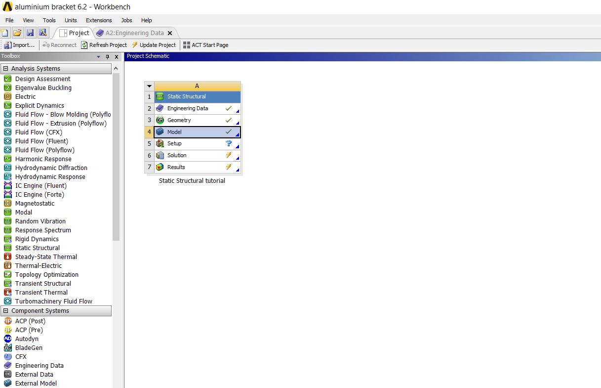 I have defined material properties and geometry of a bracket model for a static structural analysis. Clicking on the Model cell of its Structural analysis system, when I open the Ansys Mechanical, despite that the geometry seems to be defined in the workbench Project Schematic (Image 2) and at the Outline Tree on the left side of the Ansys Mechanical (Image 1), it does not appeared in the Graphics area of the Ansys Mechanical (Image 1 as well) so that to be able to apply the mesh options for the study.