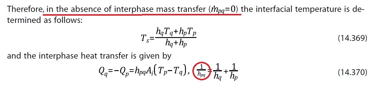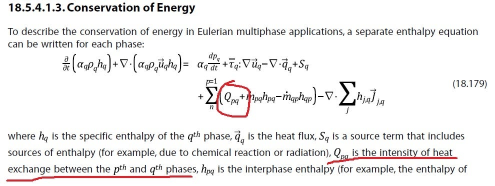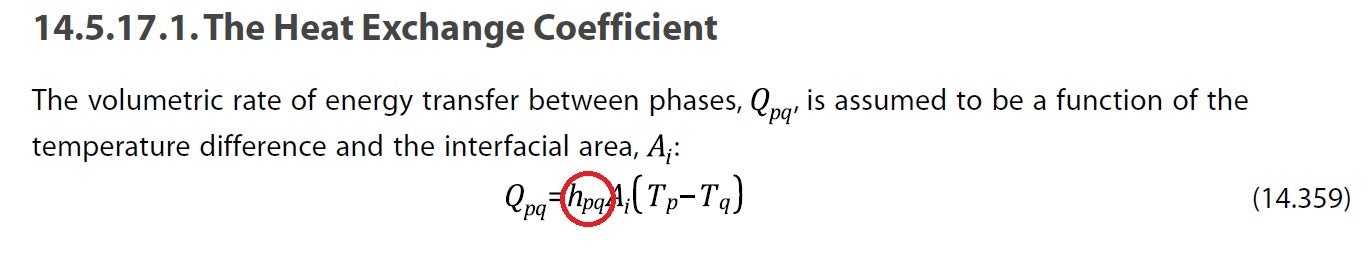 Regarding your comment, I'm not sure I'm able to follow the term you have highlighted. If you are referring to Equation 14-179 (energy equation in Eulerian model), h_pq is referring to enthalpy and not heat transfer coefficient.