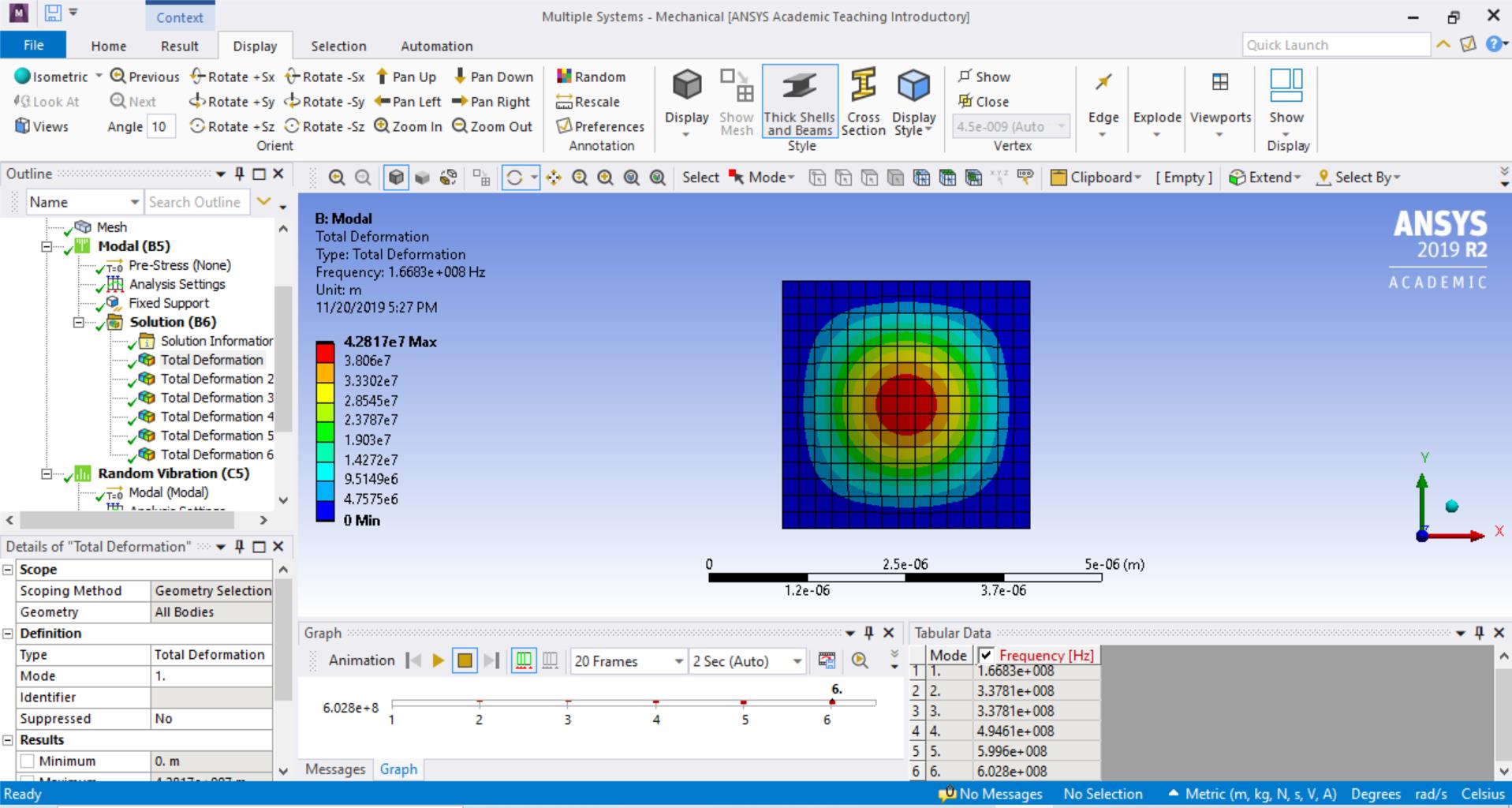 I have specified ANSYS to show 6 modes upon solving the Modal Analysis. I am not sure why only 2 modes are showing for the film with a grating design, but all 6 are showing for the standard one. The first two modes appear to be the same.Â