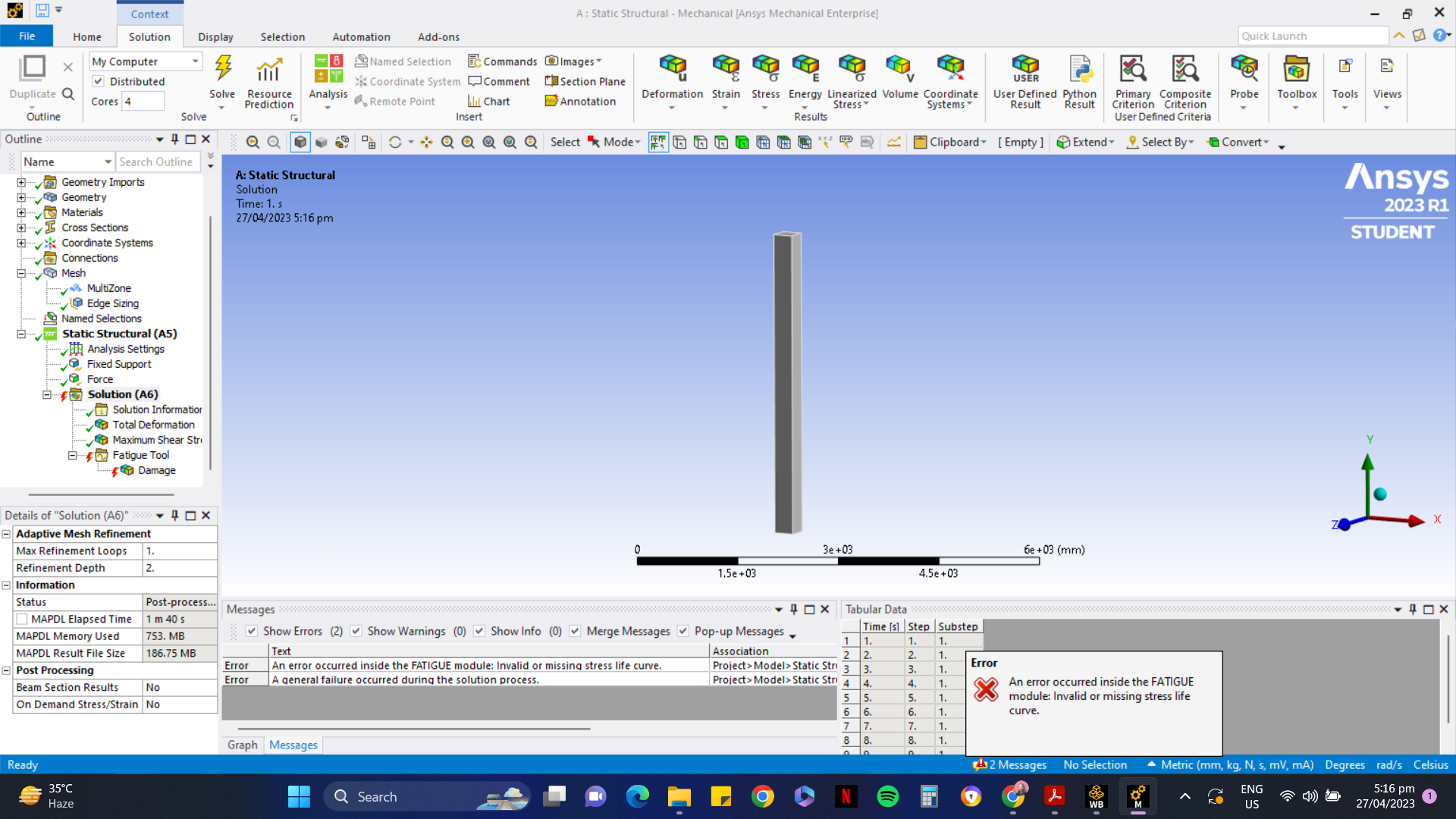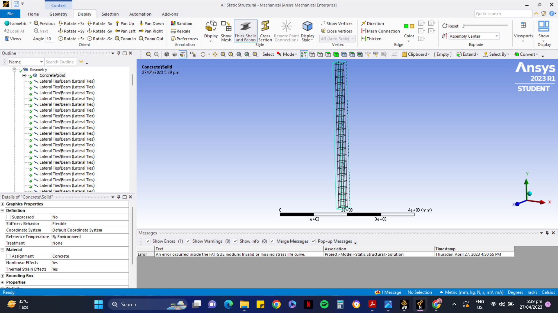 SubscriberGood day, I am currently doing an analysis on a Reinforced concrete column. I want to do a fatigue analysis but the error "An error occured inside the Fatigue module: Invalid or missing stress life curve" always show. Other forms of analysis does not have an error. The the property for steel reinforcement already has a S-N cruve.