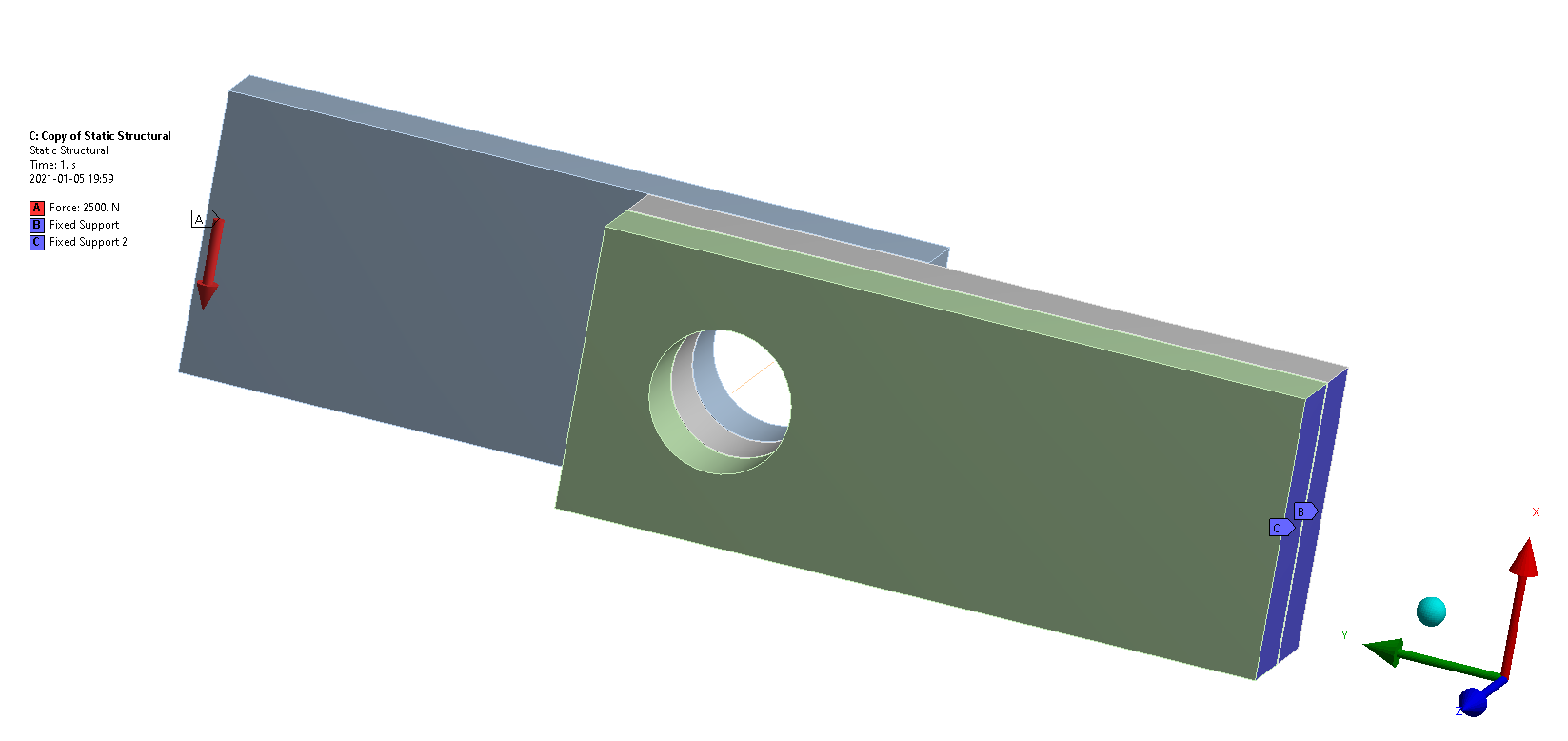 But that doesn't happen if those were not the same hole, but instead two different holes. I mean another body right after the greenish-gray one, also having a hole in there. And the line body is extended and its vertex is also fixedly joined to that additional hole. Then each of the hole will take a portion of the forces and moments. Is it correct, ? [Assume that the extra body after the greenish-gray one, also have the fixed support as like the greenish-gray body].n