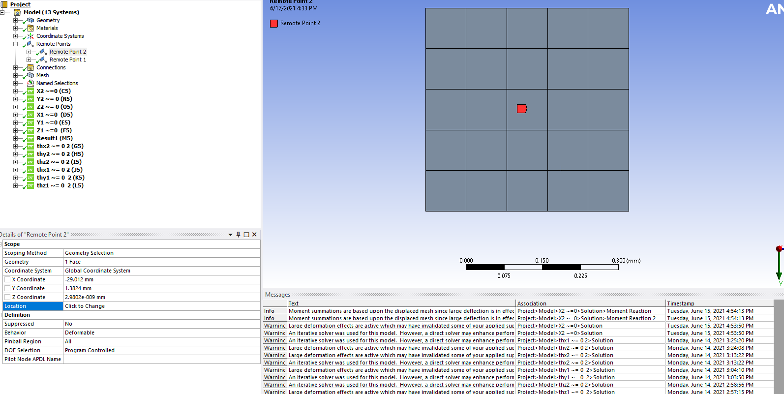 2- Just to make sure I well understood your point, if I have a remote point scope to the center of a face, and we apply a rotation to the remote point, the face it's scoped to is going to rotate by the same angles but it's not the case for translational displacement?