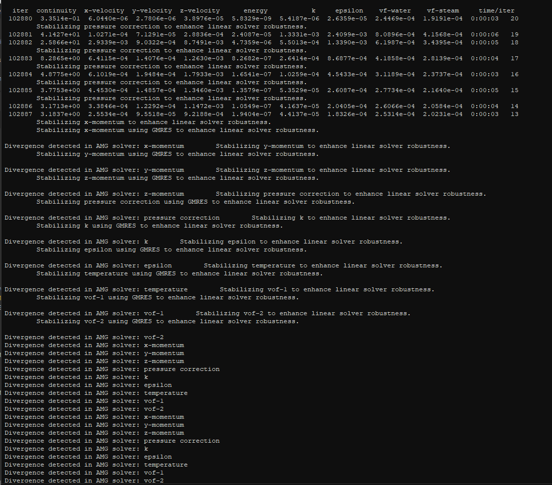 Ansys EmployeeOkay: first start simple and use a plain SST turbulence model (without any additional sub-models). Use a constant surface tension and try again. You need to find out the reason for this behavior: it actually starts diverging at the beginning of the time step.Â