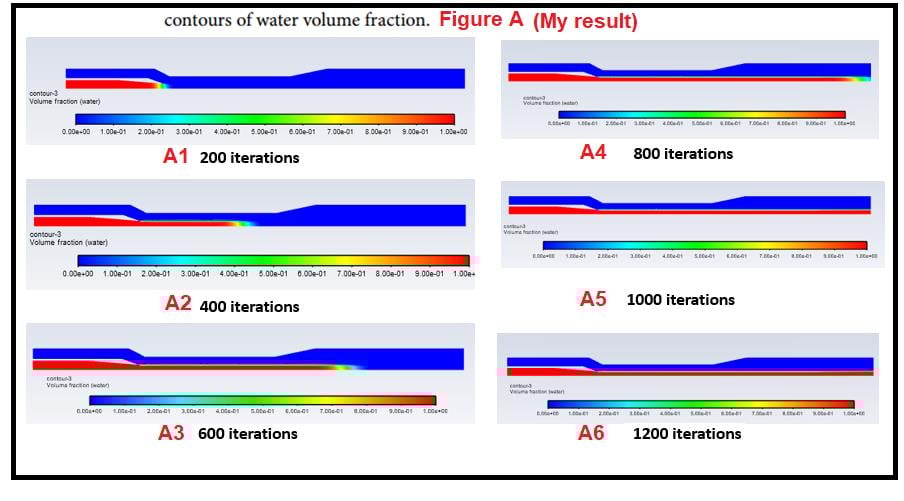 There is a problem with the behavior of water when I get the volume fraction results. as you see in fig (A1 to A5) the water flow like a transient behavior ( 200 iterations is different from 400 iterations and so on).