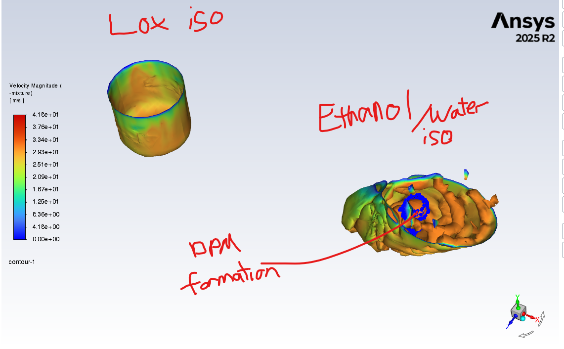 SubscriberI am trying to model impinging jets where 1 jet is 75% ethanol and 25% water by mass, and the other is liquid oxygen. I am using the VOF to DPM method. I have defined a velocity inlet, with the specified volume fraction of water and ethanol at the inlet. Water and ethanol are defined as different phases, each with a respective DPM droplet injecton defined to store the particles converted from the VOF phase. For some reason, at the start of the transient solution, the iso surface breaks up due to interactions of the ethanol and water, and imediately convert into DPM particles, instead of waiting for primary impingment of the steams to occur. This then results in "floating point error". This doesnt happen to the impinging lox jet, or when I define the fuel jet as 100% ethanol instead of 2 phases.