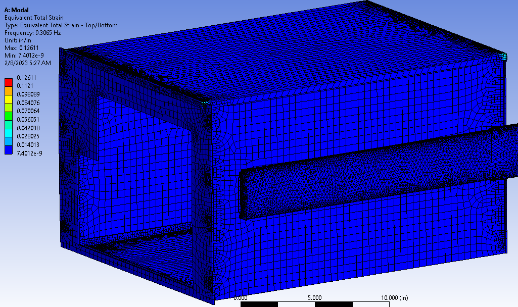 1-3 translation modes are 0 Hz but 4-6 rotation modes are non-zero, in fact they're in the single digit frequency range. So I extracted equivalent total strain and notice non-zero values for strain at each corner of the box. Can anyone shed some light on possible causes? I appreciate any help.