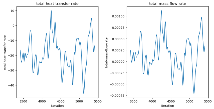 The specific heat (Cp) of oil is around 1600 J/kg k. At 5000 iteration point, total mass imbalance * Cp = 0.6522. The total heat transfer rate imbalance at this point is 12.5 W (net value considering the heat source).Â