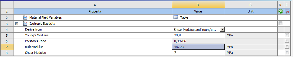 How do I get the mass modulus of the material? I have a hyperelastic material for which I only have the shore hardness and the density. Thanks to the shore hardness I could deduce the Young's modulus of the material (Gent's formula) then the initial shear Go. So I chose a Neo-Hookean model with a value of mu. But to find the parameter D1, I wanted to put the value of 0 for the incompressible material. Is it the same "d" or is it different?