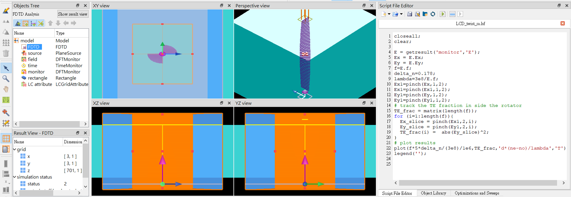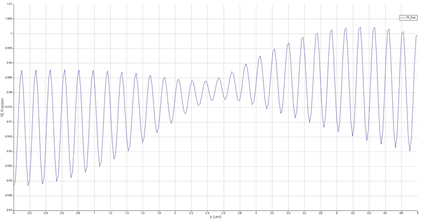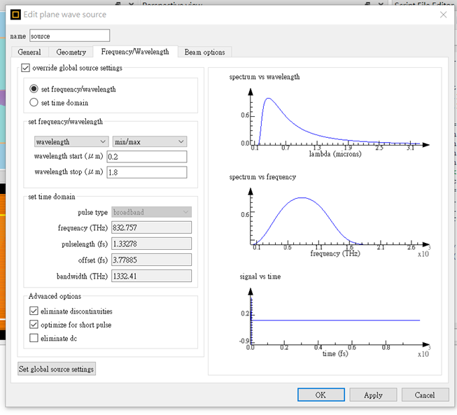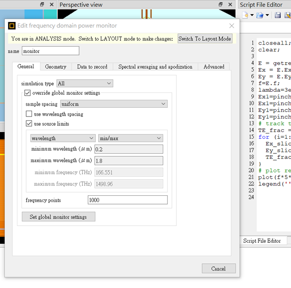 我將上面的範文的結果https://support.lumerical.com/hc/en-us/articles/360042216134,安裝一個偵測器(monitor)當作偏光片,並且將光源調整為0.2um ~ 1.8um。