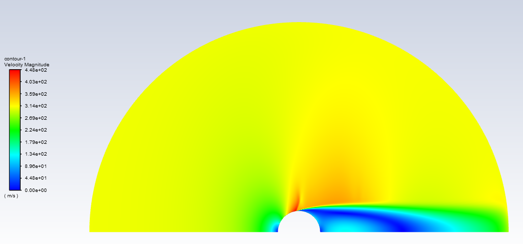 Forum ModeratorThat looks supersonic as it is: check as speed of sound in air is about 330m/s from memory. You will want a longer domain downstream to let the wake develop. In answer to the question, the pressure based solver is good to Mach 2-3 and using the pressure based coupled solver will go higher than that.