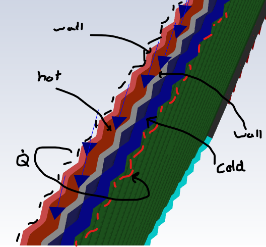 To represent the periodic nature of the full heat exchanger, I want the outer face of the cold fluid, and the outer wall (represented by the red and black dashed lines) to transfer heat to each other, as if the geometry repeated. I’ve attempted this by defining the two outer faces as a mesh interface in Fluent.