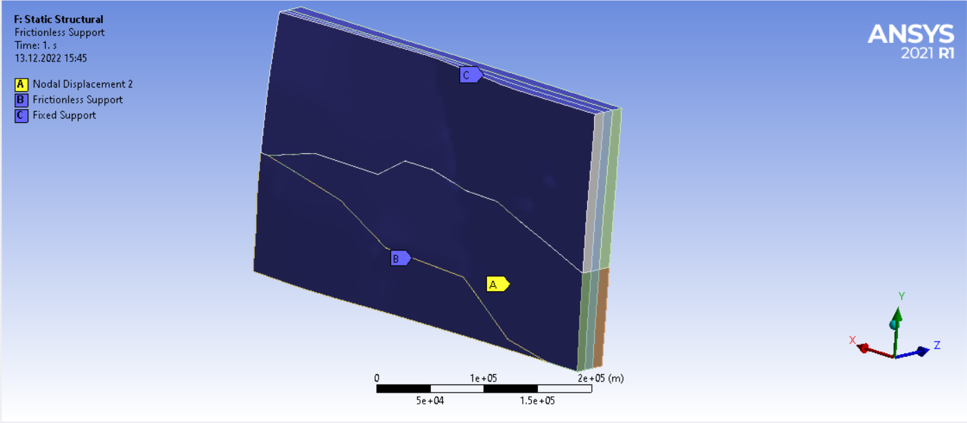 3D model is Earth structure, vertical surfaces are tectonic faults and the nodal displacements are GPS velocities. The velocities (per year values, so I use them as displacement) were determined relative to the northern part of the model from long-term GPS coordinates. I've tried to find the stress (per year) value on the fault lines.