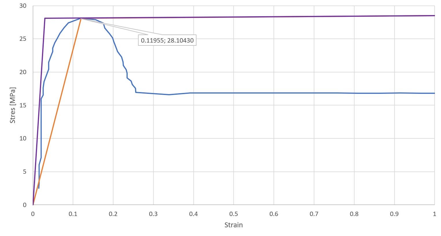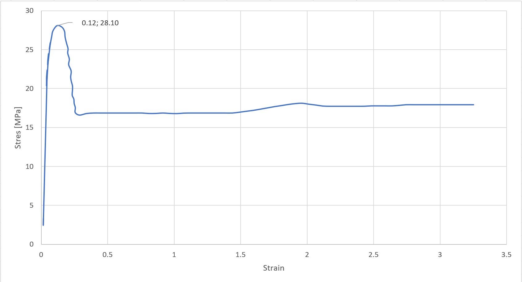 Ansys Employee,nPlease check this video on how to define a plasticity model in ANSYS . I believe the 12% strain is of the specimen and not the base material right? For example Aluminum Honeycomb structures have similar stress strain behavior to what you have shown. This means that 12% is the bare compressive strain of the aluminum honeycomb structure not of aluminum. You need to input the non linear stress strain data for aluminum, apply it to the honeycomb structure and once you simulate crushing you can get the above graph as a result.nRegards,nIshan. n -