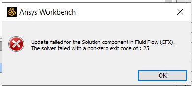 I successfully completed a transient analysis and wanted to rerun it by changing one parameter (RPM) in CFX. I did a save-as to the project file in workbench and reset the solution data. Then changed the RPM in CFX-Pre to run the simulation again with lower RPM. When I'm starting the solver, I am getting a non-zero exit code : 25. See screenshot below. Any ideas on how to troubleshoot are greatly appreciated!!
