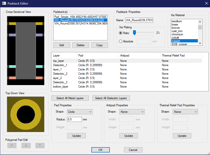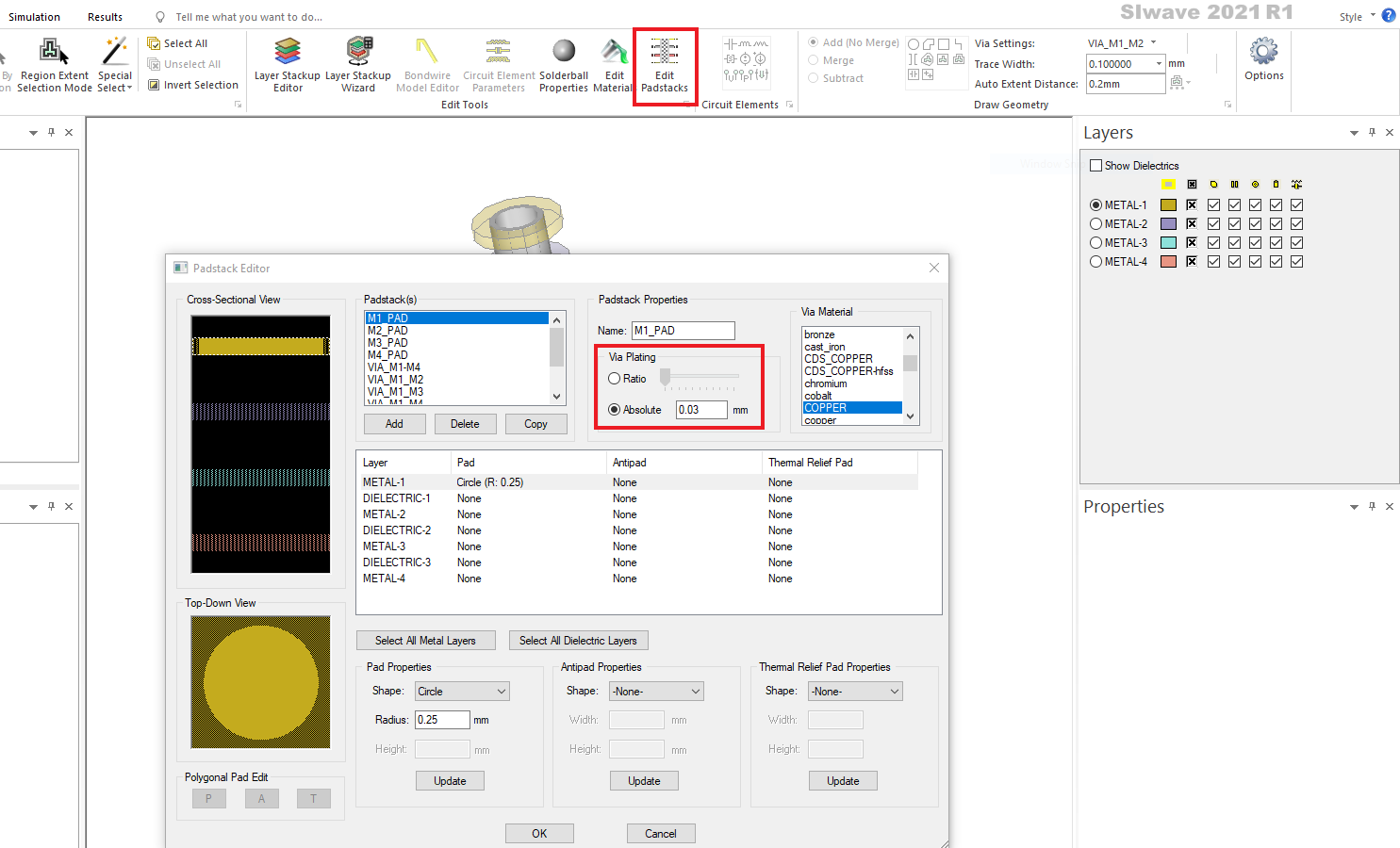 Jackson Thanks for the pictures, which helps a lot. I am noticing that Via Plating ratio has to be atleast 2% in order to properly see hollow vias in Q3D. I have tried 1% ratio, then once again I am unable to see hollow vias. I am attaching screenshot of the Q3D and SiWave workspaces.