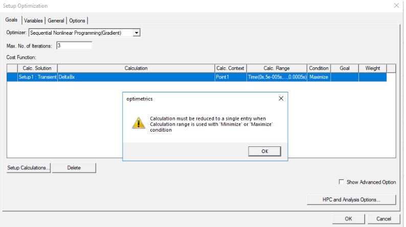 I am trying to run an optimization (using sequential nonlinear programming). I am running a magnetic transient simulation. In the simulation, I am linearly sweeping the current in a coil, and plotting the x component of the magnetic field at a particular point. I want the design parameters of the device to be such that it gives me the largest change in magnetic field over time at that point. To calculate the change in magnetic field, I created an output variable DeltaBx = integ(deriv(Bx)). NOTE: The magnetic field when the current through the coil is zero is not a non-zero value, so I can't just use the magnitude to indicate change in magnetic field. Â