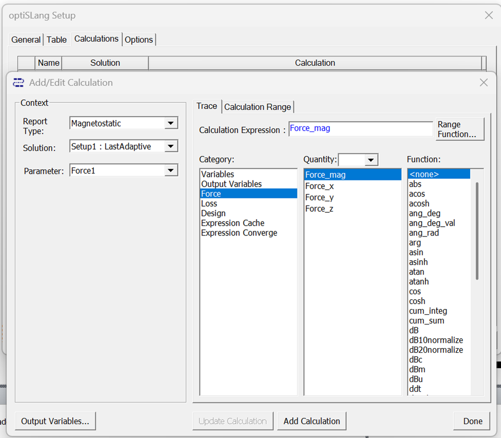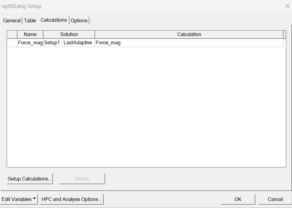 After saving the project, in Project Maneger, I right-click on Optimetrics and added an “optiSLang Setup“. In the optiSLang Setup I added a calculation: