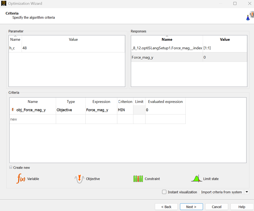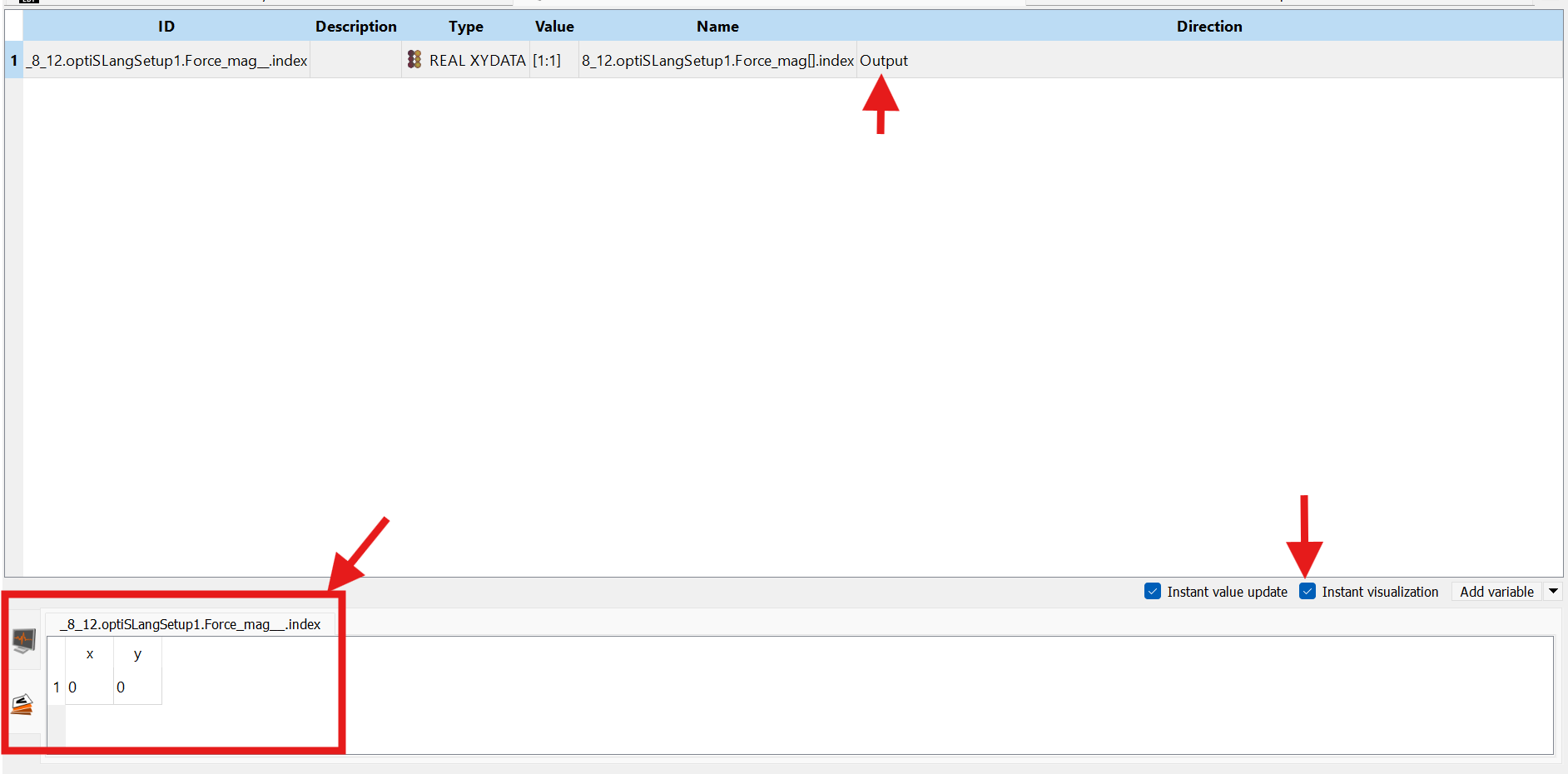 Once optiSLang window opened I noticed that the output was added automatically. I navigated to the Variables tab and clicked on Instant Visulaztion to verify the values of the response: