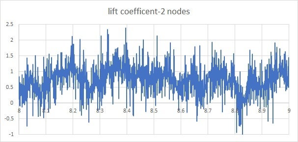 Subscriber,I am not near my laptop now. I have the graph of the lift coefficient through 1 second of the flow with 1 node and 2 nodes. (8s to 9s with 2 nodes). As you can see the second one is noisy.