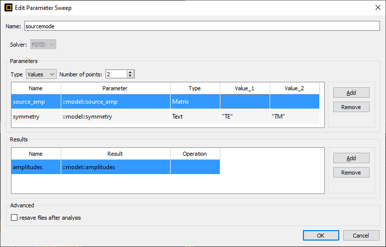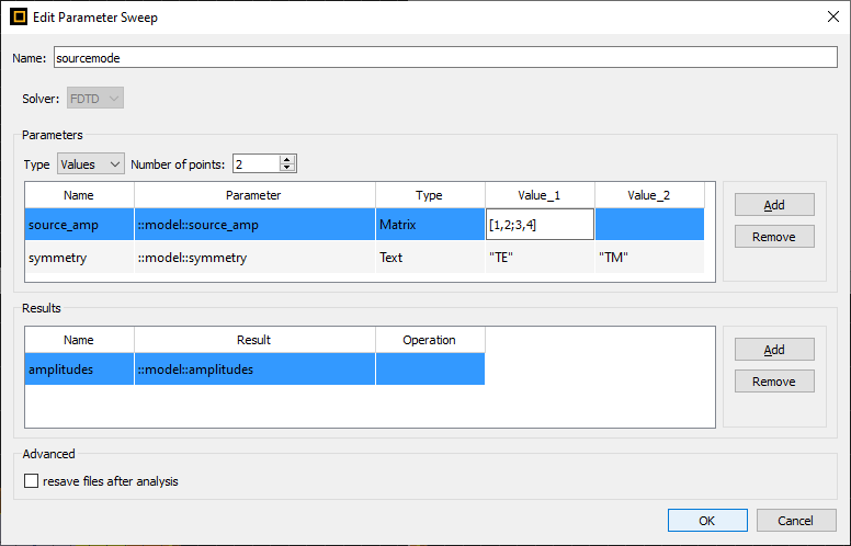 This is the "model" analysis group - I want to sweep the parameter "source_amp". As you can see, it is a matrix parameter, and it is set to a 1x3 matrix at the moment.Here, I am trying to edit the sweep with the 'source_amp' parameter from above
