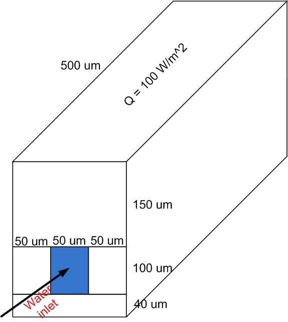 still rectangular micro-channel with cross section of 50um width, 100um hight and 500 depth. The upper wall is heated with heat = 1e6 W/m^2 (100 W/cm^2)
