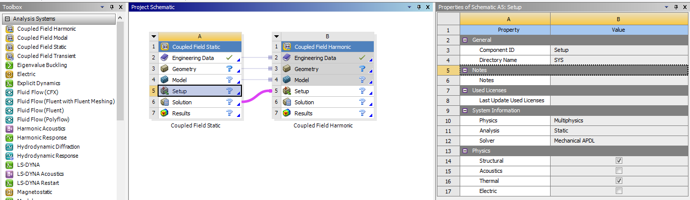 I am trying to carry out a harmonic response of a piezoelectric subjected to a pressure exerted by a prestressed screw. I have done the static structural analysis to apply the pretension to the bolt, but I don't know how to translate those results to a Coupled Field Harmonic or how to link them. Ansys doesn't let me to link the solution of the Static Structural with the Setup of the Coupled Field Harmonic. I need this last analysis to be able to apply an electric current to the piezoelectric (blue) and also obtain the impedance.
