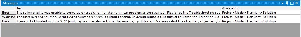 For this mechanism, I would like to know the pressure and displacement on the sliders. I studied in Transient structural which I applied displacement on the lower guider as a initial condition. When I gave the conditions as above mention, the pin inside the curved slot did not run follow the curve which meant the pin was interference with the CAM. I set the displacement and the message are shown as below: