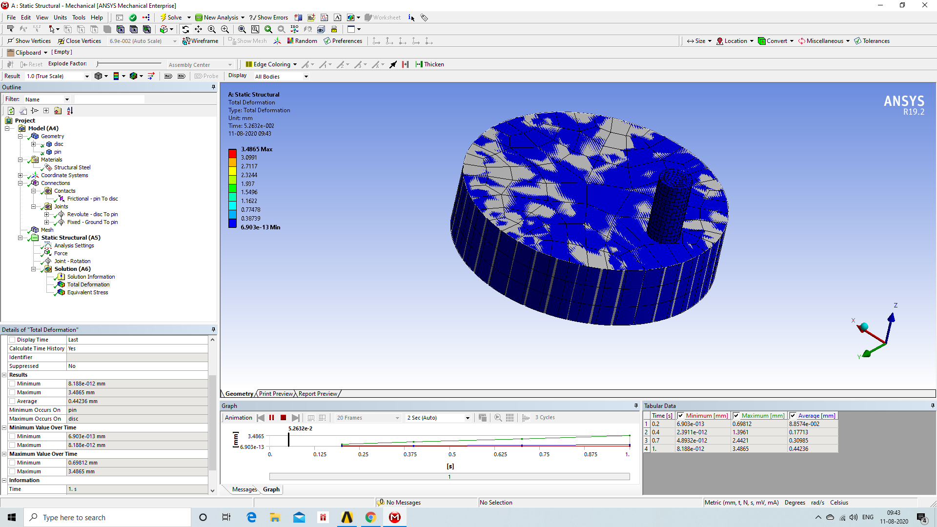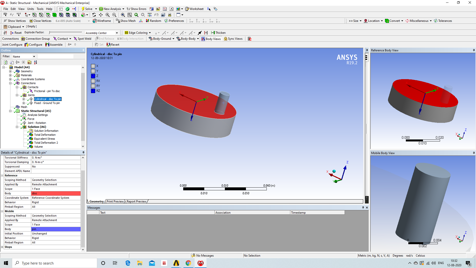 SubscriberHello,nnthank you for your response.nthe results are same, no changes are seen even after changing re volute to cylindrical. nALSO, To make myself clear i have selected stiffness behavior of disc as rigid and pin as flexible in geometry. nand top of pin is fixed, and there the force is being applied.nnkindly advice nthe model that i am trying to simulate roughly looks like thisn