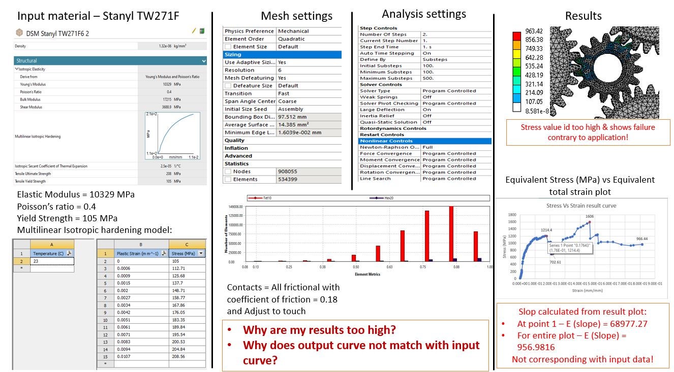 - For the mesh, you can used sizing or split the model and just get the fine mesh closer to the contact regions and roots of the gear teeth where you see the high stresses.  You will need a nice smooth fine mesh at the tooth to tooth contact. I can't tell but from what you shared in the image your mesh is too coarse and you are most likely getting extrapolation error.Â