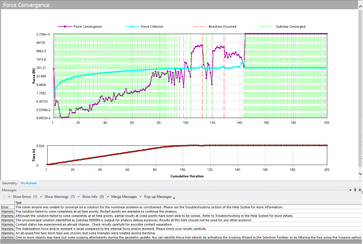 Now this all makes sense but I the question is, is there a way to allow the analysis to go further? I would like to see more buckling and then see the spring-back in a second step where the force is removed. So far the analysis fails before reaching step 2. I tried reducing the loading until it converges (about 55,000n) and I got the analysis to successfully move to step 2 but there is no buckling (Step 2 did fail but I think it's because I had it set to auto time stepping).