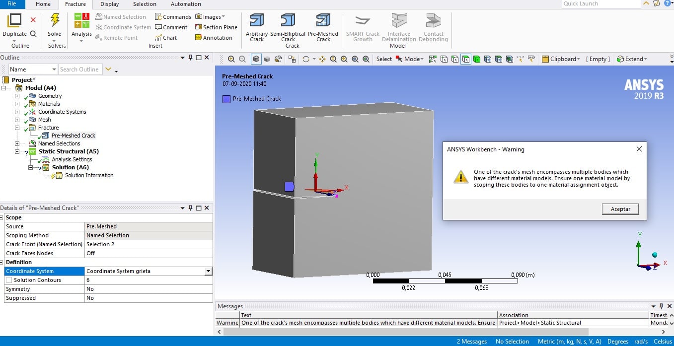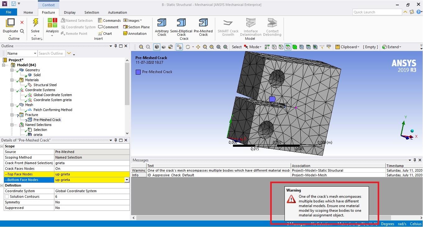 I would like to know how to solve the warning message that appears when I try to define the pre-meshed crack. It says: