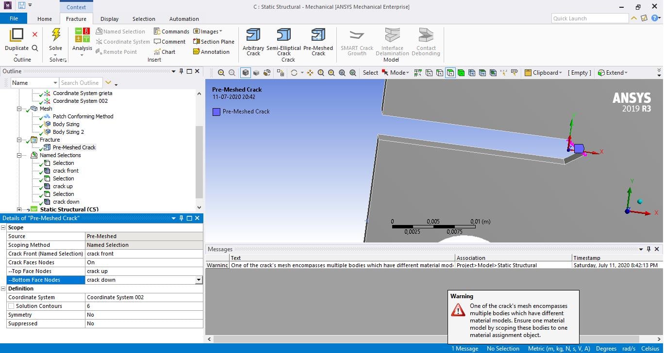After that, I added the two nodal named selections that you mentioned. The coordinate system is located in the centre of the edge where I'm trying to define the crack. But the same warning apppears once again.