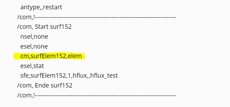 I'm struggeling with the esel command. In the simulation I create surface elements at the external nodes of an workpiece within the /prep7, then I go back to the /solu. A single frame restart analysis: