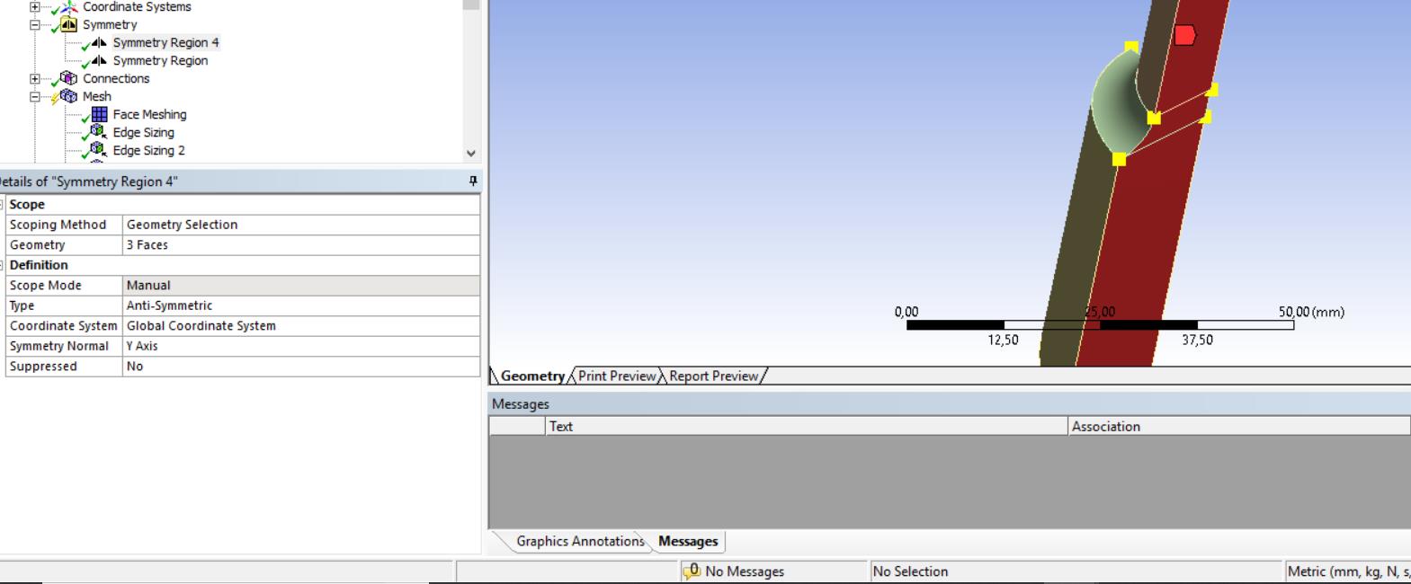 so, what am i doing wrong? i've already tried to remove the displacement on the antisymmetric constrain and selecting a frictionless support, i've finished my ideas