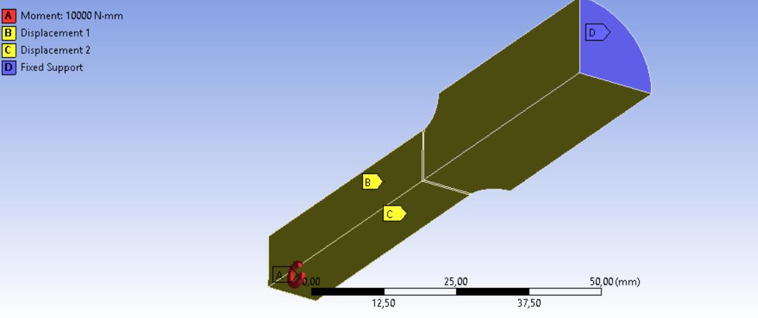 i've divided the shaft and i've only 1/4 of the shaft, then i put the symmetry and antisymmetry constrains with displacement (1 and 2) and i put the bending moment on a side of the shaft and a fixed support at the another side