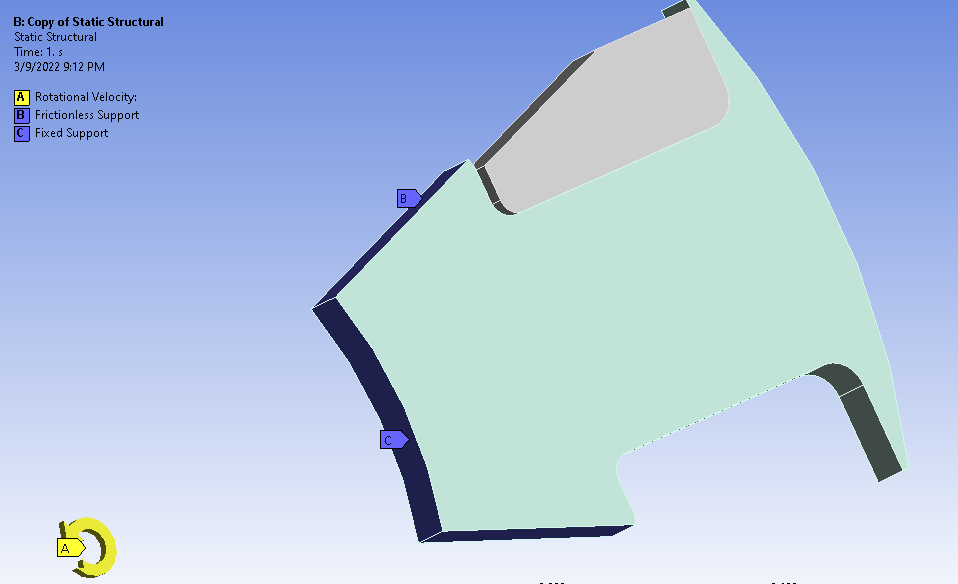 Note: The applied load is a rotational velocity about the z-axis (in/out of page). The two bodies are joined via a bonded connection. Ideally, I would like to change this to a frictional contact, but wanted to keep it simpler for now.