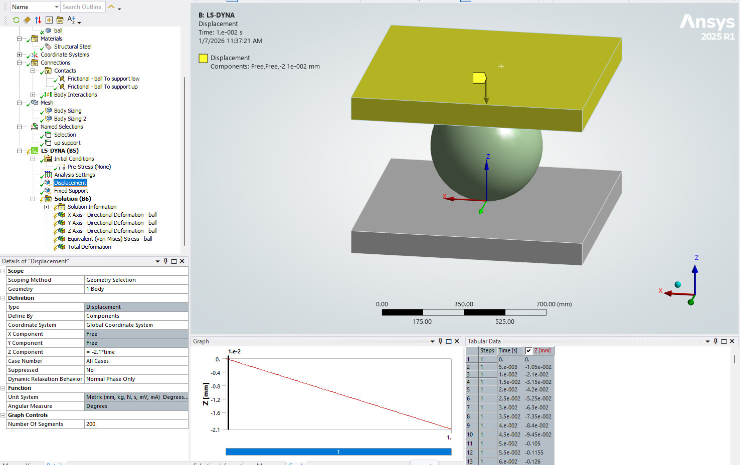 The picture below is from a ball compression test. The lower support is fixed, while the displacement command is defined for the upper one.