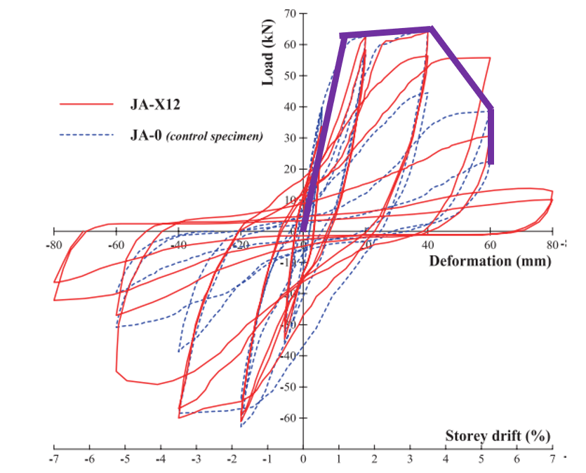 Where do you determine that failure occurs? Hysteresis curves are typically not taken to failure. They have assumed failure as the point where the hysteresis loop can't sustain any more deflection than the previous hysteresis loop. But from the JA-X12 curve we see the failure occurs later. This is related to the first point, but in particular I think the determination of failure is probably the most difficult. They probably could have just used figure 54.4 without the failure section, just terminate the plastic section.