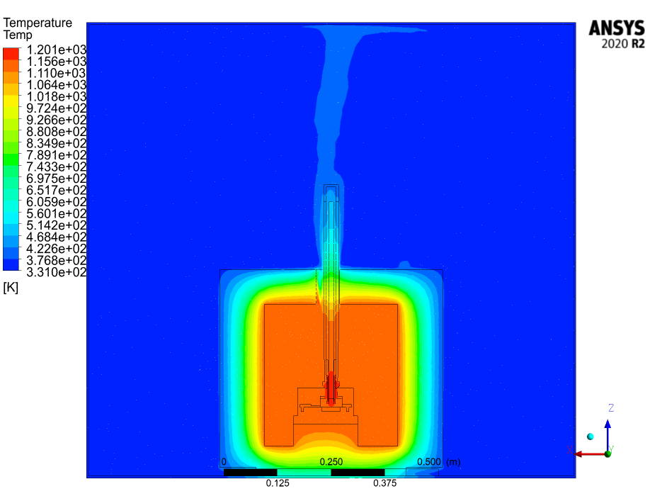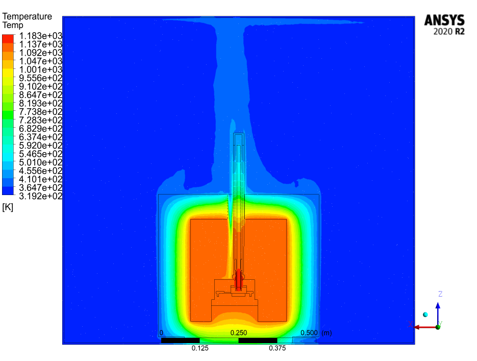 You can see the ofen in a closed domain of air (and a barrier of plexiglas on the outside). The inner wall of the ofen is a heated wall, inside the ofen is a ceramic housing and this rod coming from above. Inside this ceramic is another heat source as you can see with the red color.