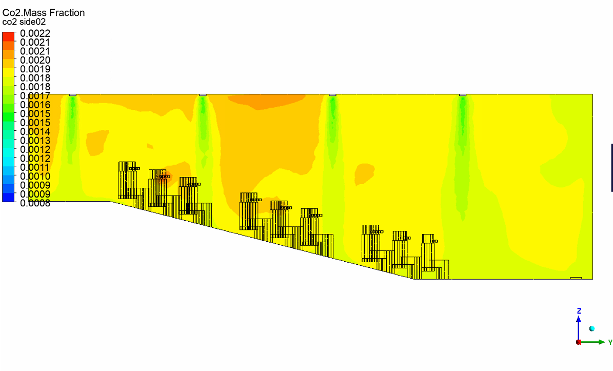 I am currently performing a CFD simulation using ANSYS Fluent to study CO₂ distribution in a classroom with multiple occupants. The model includes supply air (SA), return air (RA), and CO₂ sources from human breathing.