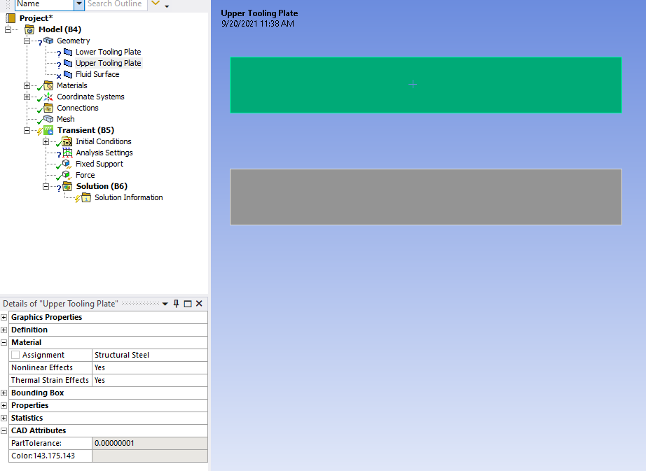 SubscriberI am trying to build a 2D fluid structure interaction model where 2 plates come together to compress and squeeze out adhesive substance in the middle between the plates. I am working to define the mechanical side of the problem first and am running into an unknown issue. After I built my geometry surfaces in spaceclaim, I launched the Ansys Mechanical mesher and noticed that my 2 tooling plates both have question marks beside them in the geometry section of the model tree.
