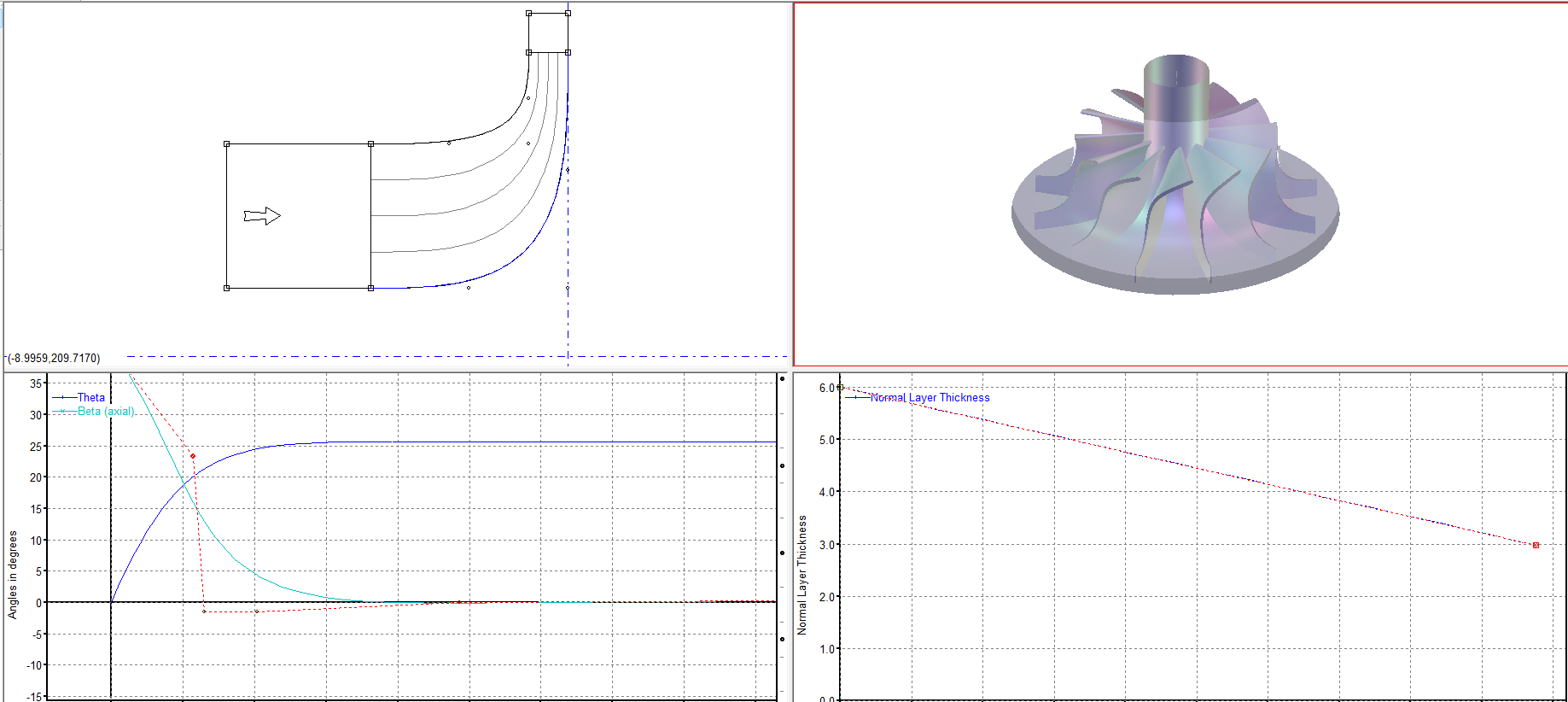 To impose a non-zero rake angle you would want to shift the entire theta curve up or down on each layer except for the hub. By shifting the entire theta curve, the beta distribution on that layer is unchanged. Rather, the blade section at that layer is shifted in the circumferential direction. In the above example, shifting the shroud theta curve downwards by 10 degrees: