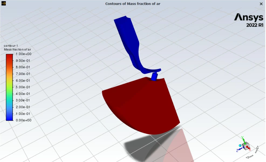 I initialized the jet with a pressure inlet at the top at 983700 Pa with an initial velocity of -0.01 m/s. The pressure outlet is the curve along the bottom hemisphere region, set at 98370 Pa. As you can see, Argon is set up for the bottom hemisphere as the ambient and hydrogen is filling up the rest.Â