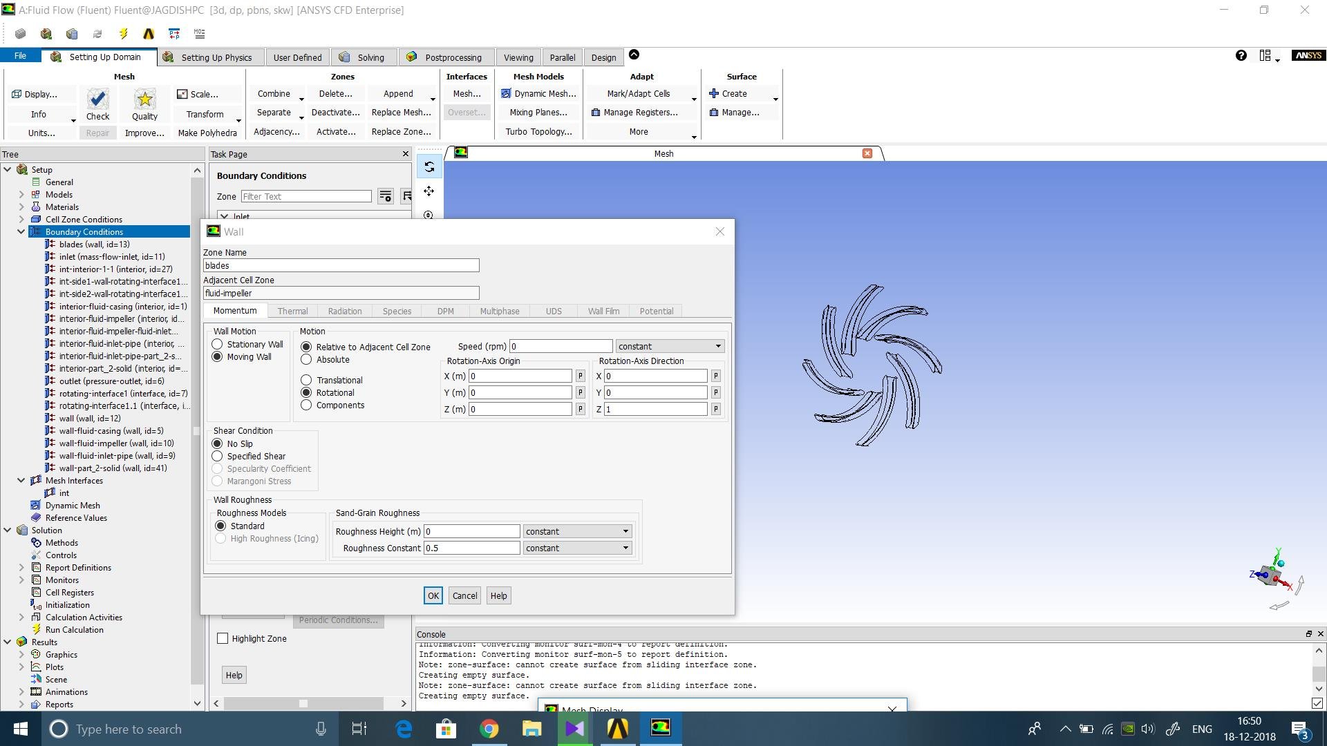Forum ModeratorThe cell zone around the impellor is set to rotate (I think you've done that). The impellor wall should be moving at zero speed relative to that zone. The outer casing may need setting to stationary if the rotating zone also touches it. Â