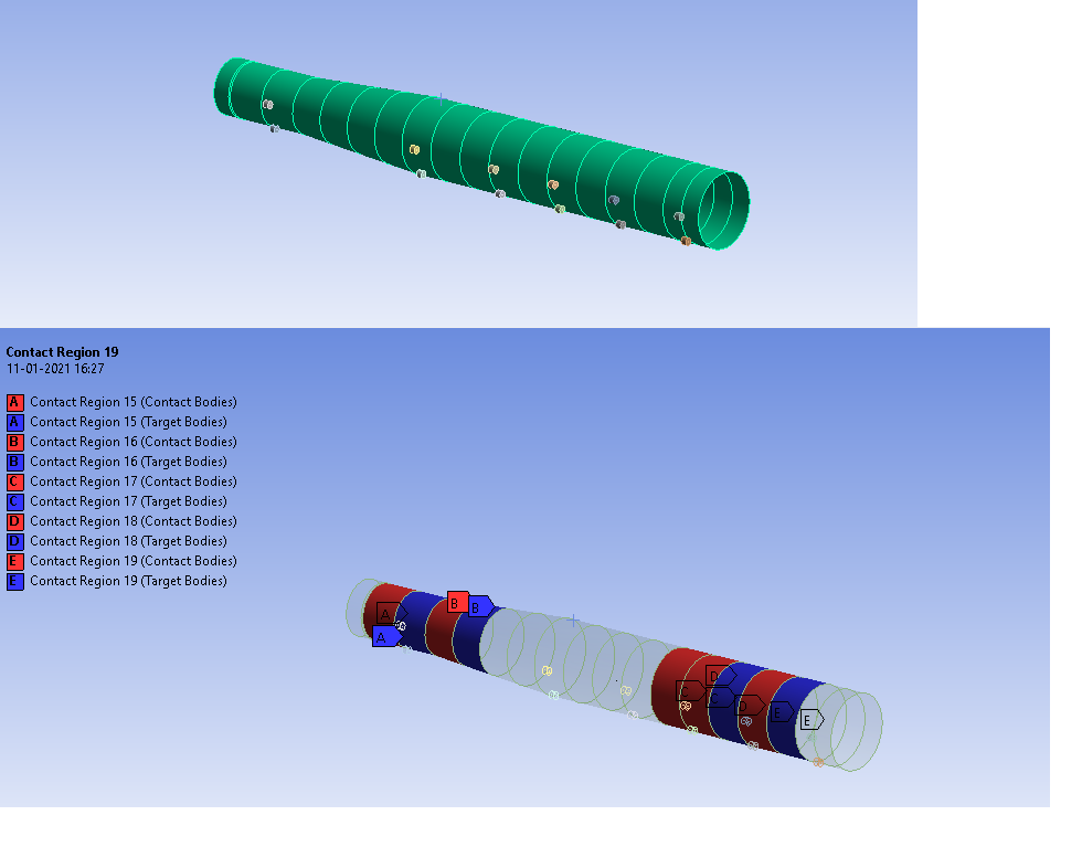 SubscribernYou don't have duplicate surfaces, I accidentally did that when I was splitting the tubes, as I mentioned above.nDelete all the automatically created Contacts between the tube edges since you are using Mesh Merge (or Share button) to connect them.nThe frictional contacts all must have Adjust to Touch. I think this is why your model is not starting. I made a nice mesh on the rollers. I added very light spring to ground from the center of one end using a deformable connection to the edge, just in case the lack of an axial constraint was necessary. I could delete that and see if it was necessary.n