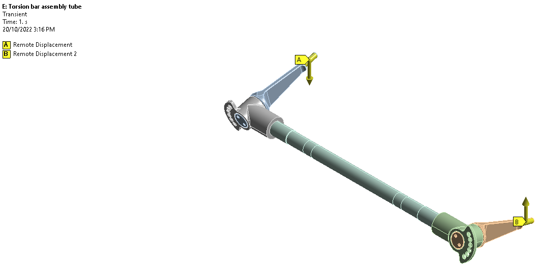Upload a Workbench Project Archive .wbpz (NOT .wbpj) file by using the File, Archive menu to a file sharing site such as Google Drive, OneDrive or Jumpshare and paste the link in your reply. I will have a look at both the full system as well as the torsion bar only. When you reply, also say what version of Ansys you are using.