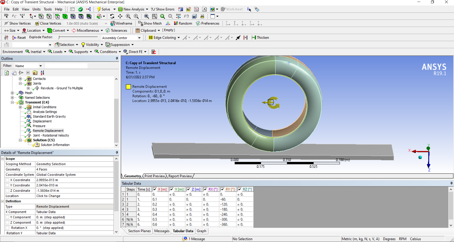 Hi! Your remote displacement will turn and move the wheel, while the rotational velocity doesn’t actually move anything. It creates forces radially outwards (centrifugal force) as if your part was spinning. Whether you chose the surfaces correctly depends on the problem you are investigating, but your selection will at least make the wheel move and turn.Â