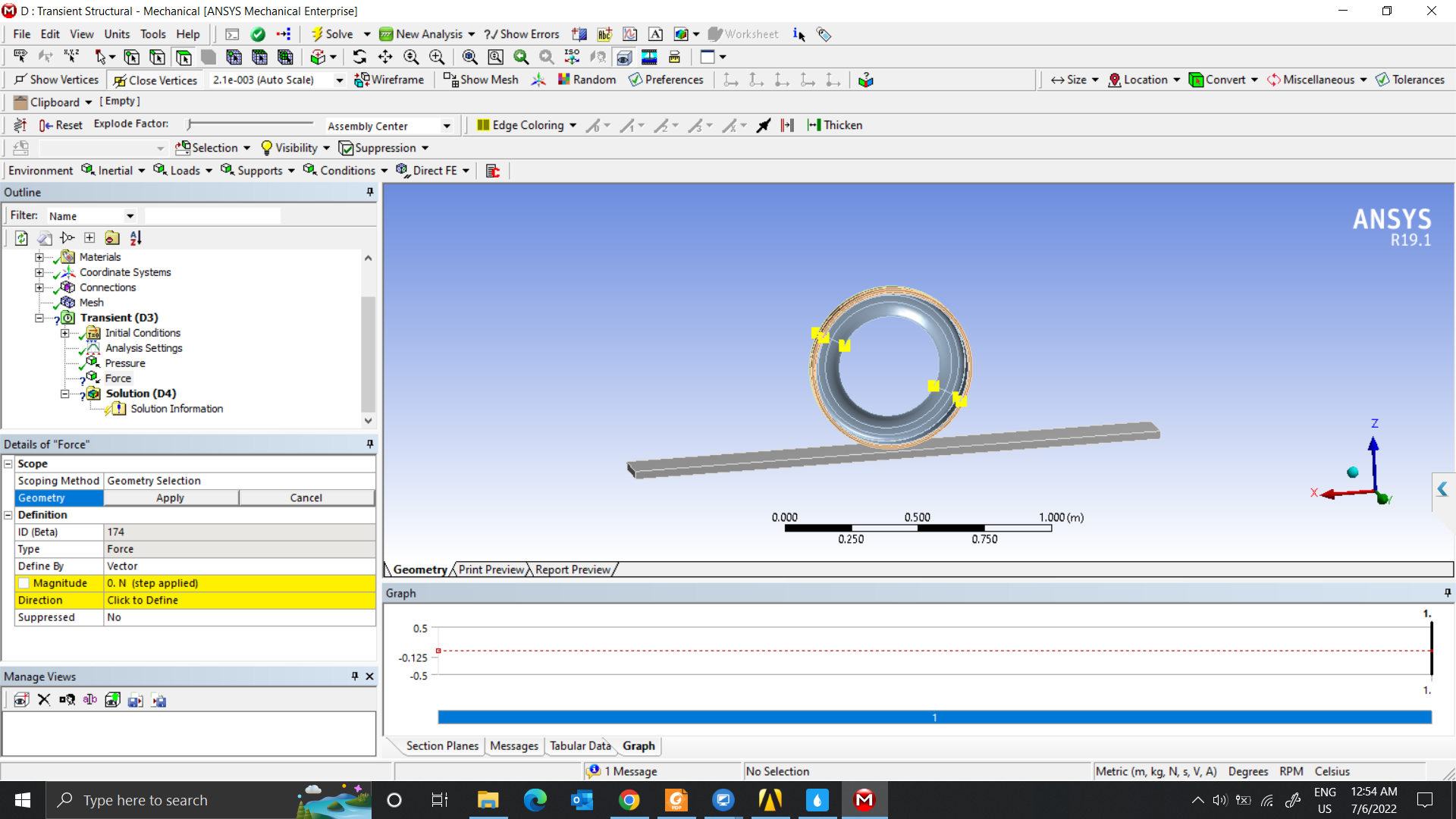 Step 2 moves the dummy body Translational Joint by a small distance to squash the tire with Time Integration Off. Probe the Joint Reaction to measure the Force.Â