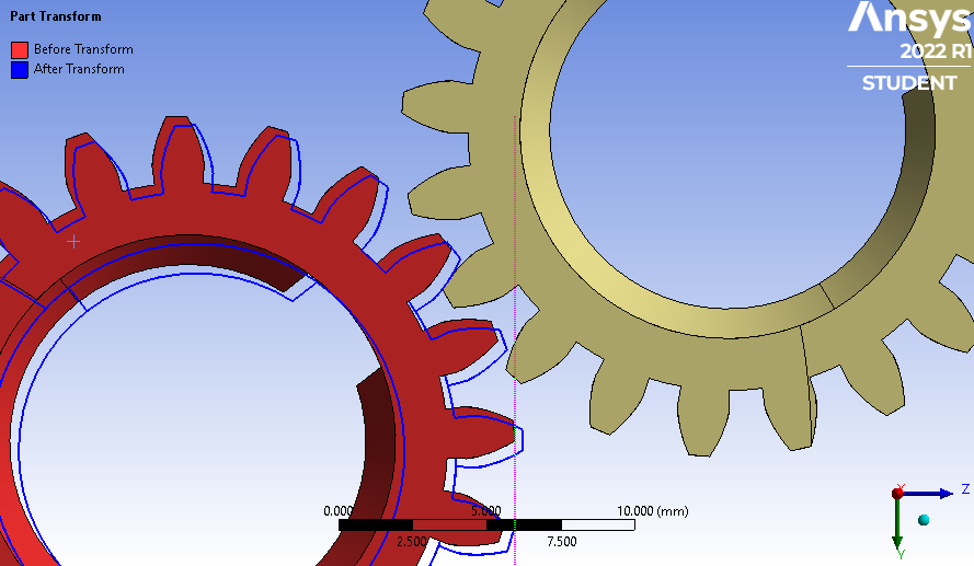SubscriberThe gear teeth should be tangent to each other to begin the simulation. I opened the Geometry in SpaceClaim and moved one gear tooth face to be tangent to another tooth face.