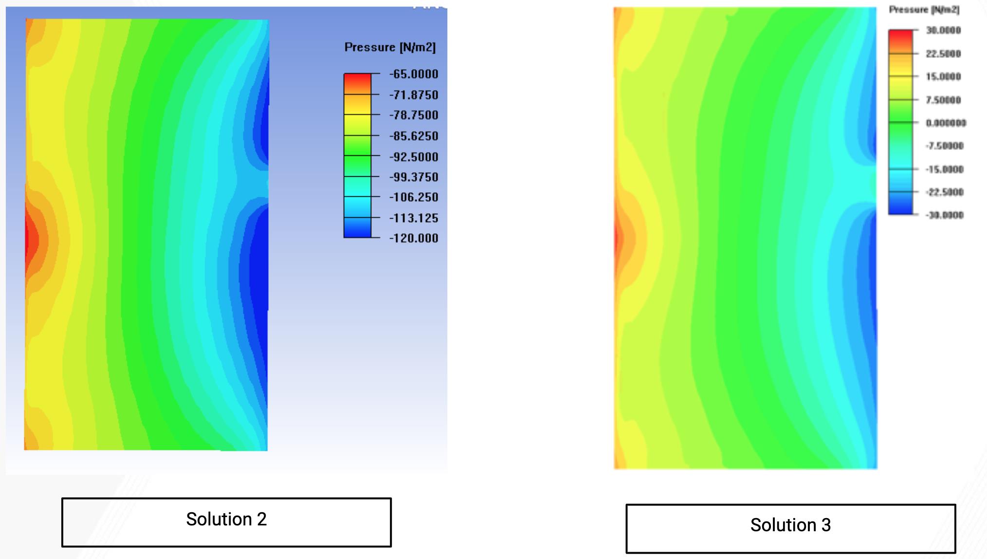 Ansys EmployeeSolution 1 is equal to Solution 2 but both differs in pressure magnitude from the pictures the student left. I would first contact the masterand. Better export the settings of each case file and use diff on Linux or similar on Windows and compare the settings. Also use other initialization. Possible that there is a grid change but I doubt why it does only affect pressure. -